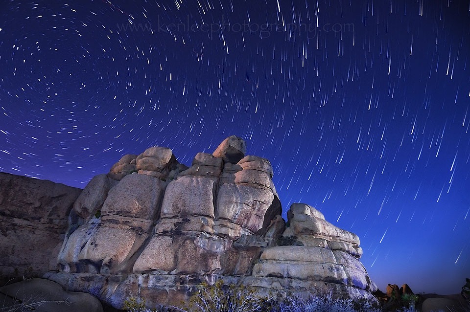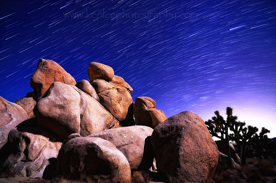 Title: Trinity Star TrailsInfo: Nikon D7000, Tokina 11-16mm f/2.8 lens, Feisol tripod. 44 stacked photos, each one a 30 second exposure at f/4, ISO 500, totaling 22 minutes. The tree and rocks were"light painted" with a Dorcy LED flashlight but also have a lot of moonlight illuminating them. Photographer: Ken Lee Location: Joshua Tree National Park, CA USA |