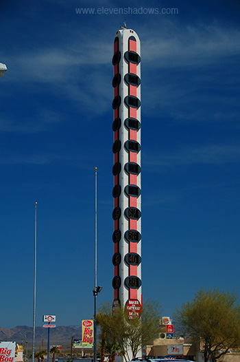 she said. "She's 62. I want to see her before she stops performing."Road trip up the 15 with the requisite stop at Baker. Baker is the self-described gateway to Death Valley. And Baker is also home of the world's tallest thermometer, towering above the Bob's Big Boy at 134 feet, representative of the brain-melting 134-degree temperature in Death Valley in 1913, a record that still stands to this day. The Baker thermometer has, of course, a digital read-out. Sure, strong winds had already blown the thermometer down, smashing a gift shop. But really, wouldn't it be cool if this thermometer had a glass tube filled with mercury? Surely, just this once, we could throw caution to the, er, wind and truly have the world's tallest maximum thermometer and make Daniel Fahrenheit proud? |