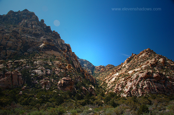 Rock Canyon in the mid-day sun.This is its most noted feature, the Keystone Thrust Fault, the contact area easily visible by the sharp contrast between the grey limestones and the red sandstones. |