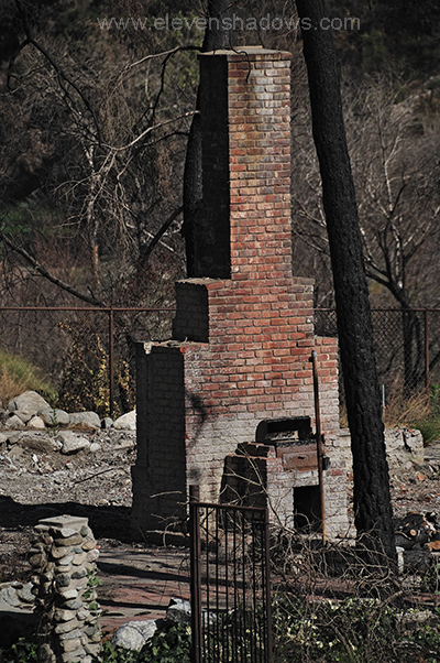 Buckhorn and Trail Canyon Trail.But last year, on August 26, 2009, an arson fire grew worse, eventually burning 1/4 of the Angeles Forest, destroying 91 homes, many near where I had lived, and killed untold wildlife and two firefighters. The fire burned for two months, and was the worst fire in LA County history. When I heard that Buckhorn was reopened, I left the next day to see how it was, camera in hand. Photo: blackened trees swathed in early morning fog, 5:30am, along Big Tujunga Canyon. |