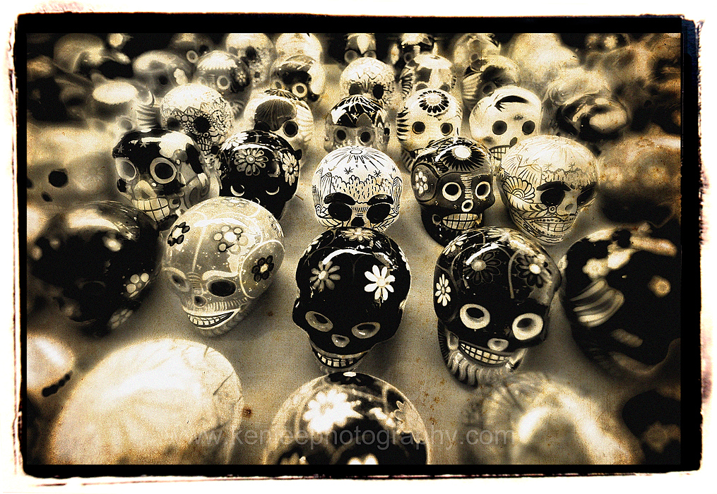 A common symbol of Dia de los Muertos is the skull, represented in masks called calacas. Sugar skulls, inscribed with the names of the deceased on the forehead, are often eaten by a relative or friend. |