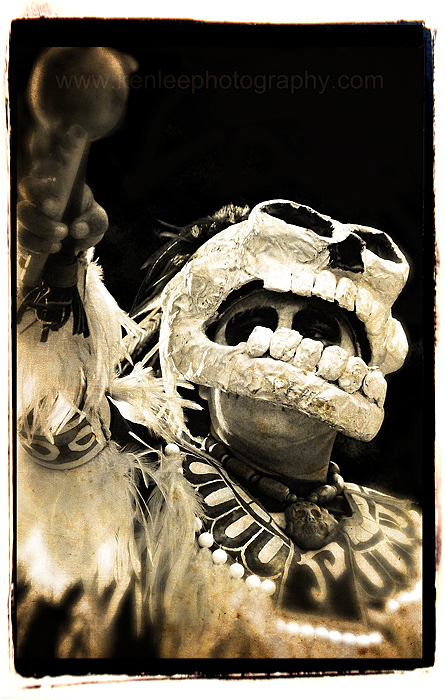 Skull man, one of the Aztec dancers performing, at Dia de los Muertos (Day of the Dead) at Hollywood Forever Cemetery. |