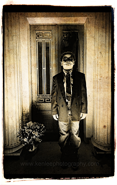 Kid by crypt. The creepiest scary movie directors know that kids are scary, and this is illustrated by this photo here. |