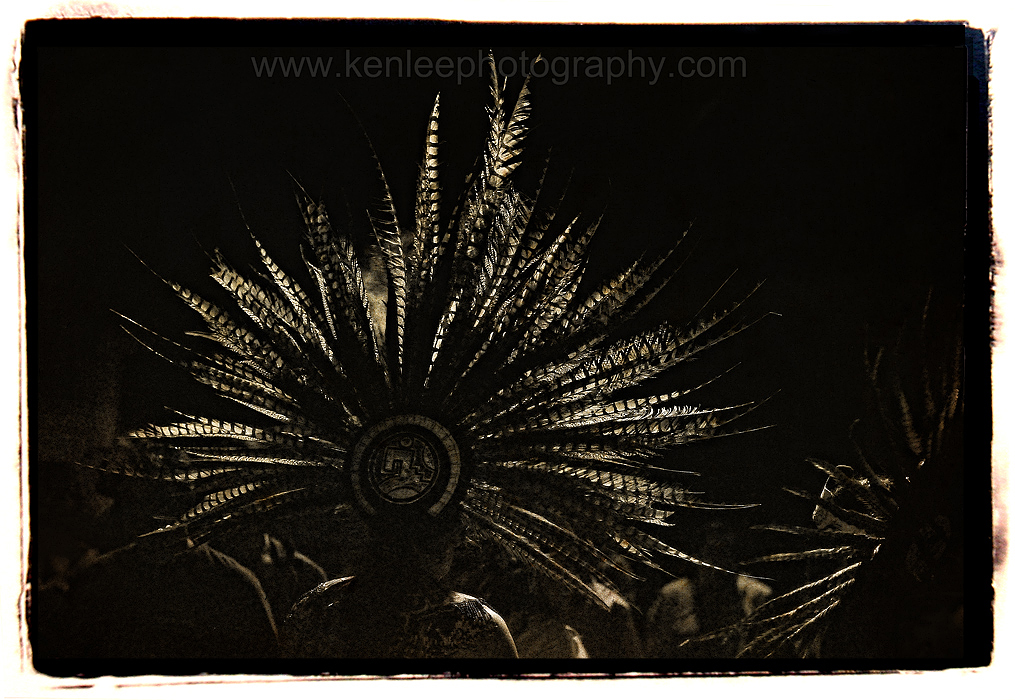 Aztec dancers' feather headdresses beautifully backlit in the night while performing. |