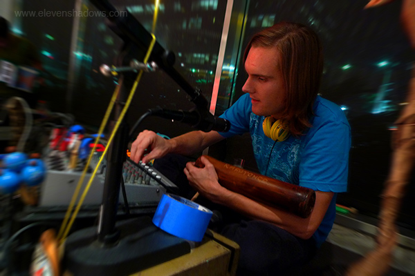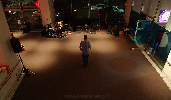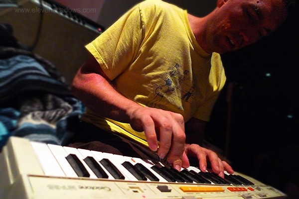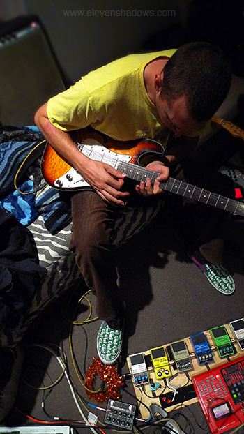 of the two gongs that I purchased from a Buddhist temple in Mandalay, Burma, a beautiful higher-pitched gong that twirls when hit, pleasing the sound nerd that smiles within all of us. I had arrived late. And I left early. The knife-pain in my lower back announced their dissatisfaction with sitting for two and a half hours on the floor. As I drove around the building, I saw that the gig had just ended. Oh well. Thank you so much to Mitch for inviting me to play with Golden Hits. What I think of most about this gig was how much fun it was, so much so that I never saw Lucky Dragons perform.