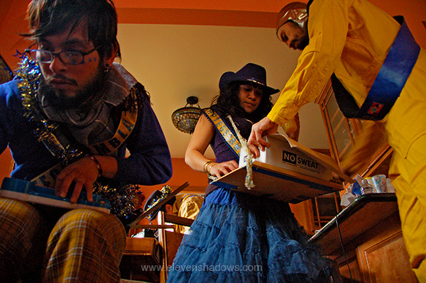 the joys of circuit-bent toys. Yes, our mission was set.From the website: "The Highland Park Thursday Evening Gentlemen's Society Circuit Bending Marching Band And Ladies Auxiliary is a collection of eccentric lunatics I call my friends, and my wife Mona. I include myself in this description as well. We have battery powered amps (Roland Micro Cubes this year) into which we plug circuit bent instruments for the purpose of marching in any parade that will let us. Most of us are not benders, but those of us who are provide enough bent devices to go around." Cacophonous goodness, mm-hmm. Art, Elizabeth, and Mitch. |