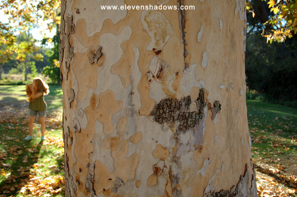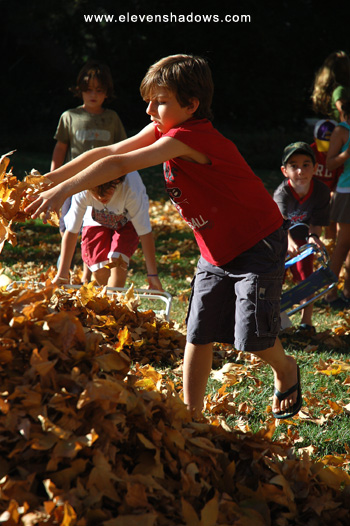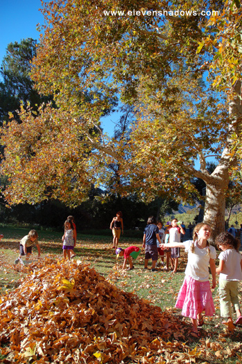 playing, throwing leaves into a large pile at the Peter Strauss Ranch just