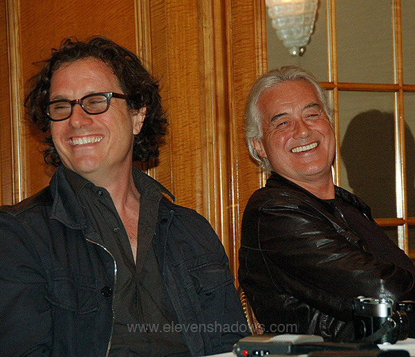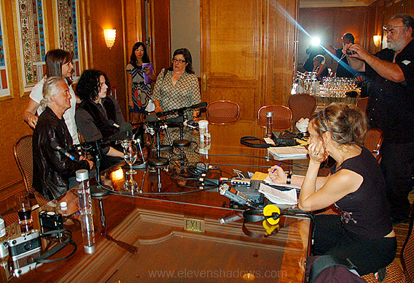 Guggenheim and Jimmy Page.After half an hour, the press conference was over. The left. I was elated. I had managed to kneel next to the front row for the entire press conference, shooting photos unimpeded. I couldn't ask for a better day. Outside, though, Christal was upset. "We're not on the list for the one-on-one!" "One-on-one? An interview?" I had no idea. "Yes, we're supposed to have a one-on-one interview with the three of them, but my name's not on the list!" We asked several organizers. "The Huffington Post doesn't usually do press conferences," Christal pointed out, "so we won't be able to do an article." One woman who seemed to know and respect Christal, said, "I'll get you in for five minutes. But just five minutes!" "We'll do it in 4:45," Christal said, "I've been on both sides of this. We'll be out of there in 4:45." They knew Christal, and knew that she would be good to her word. I could not believe my luck. |
