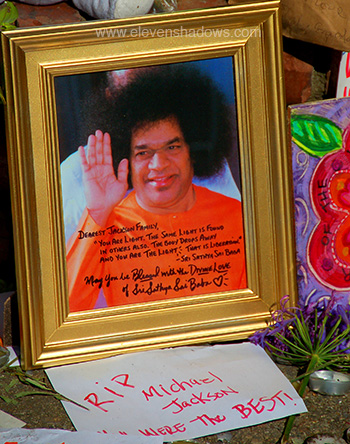 visit the Jackson family.I walked up to the makeshift memorial in front of the house, also barricaded. Adoring fans had put signs, cards, balloons, photos, stuffed animals, votives, everything to show an outpouring of love for their fallen star. I must confess, though, that I was a little surprised to see a photo of Sai Baba among the photos. |