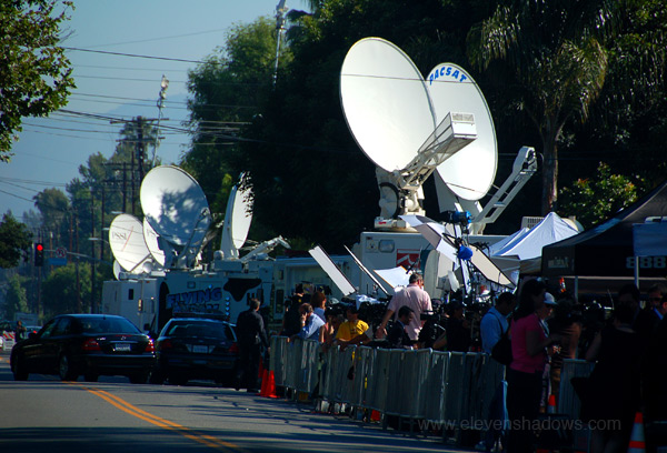 ends. White media trucks with satellite dishes lined the entire block