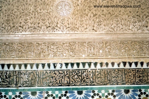 The above is plaster mixed with marble powder, and is carved with designs and quotes from the Q'uran. Below that are tile inlays. |
