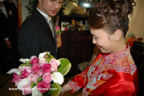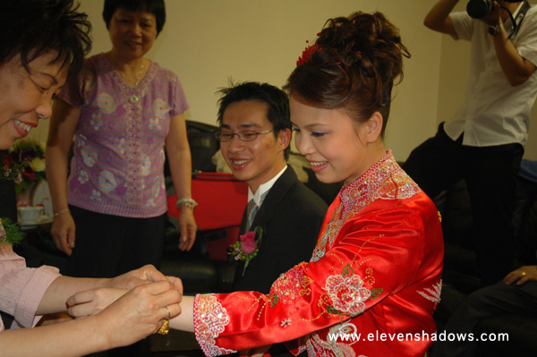 bracelets to Misty.In the tea ceremony, Misty and Kevin served tea to the family members, calling them by their new official title (in Chinese culture, we have very specific names for all family members, with their titles changing after the wedding to indicate their new status in the family). Drinking the tea symbolizes acceptance into the family. We also give the couple money in red envelopes, which symbolize good luck.