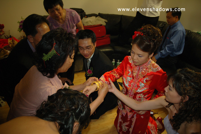 A tea ceremony before a wedding serves as a means for both parties in the wedding to meet or reconnect with members of the other family. Here in this photo, Misty's parents, sister, and bridesmaid put on more gold bracelets. |