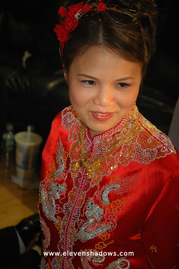 wearing a traditional red silk dress for tea ceremonies, the color for good