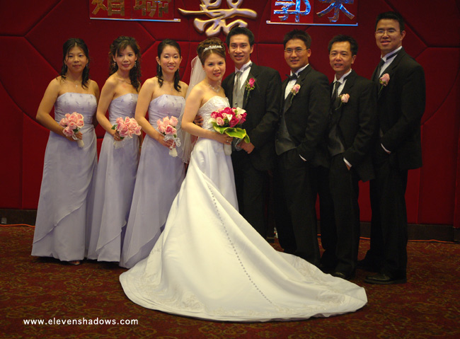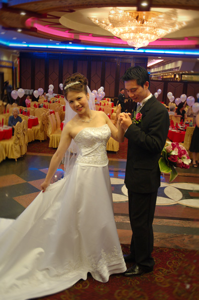 and Kevin at the wedding ceremony at Jing Fong Restaurant in Chinatown,