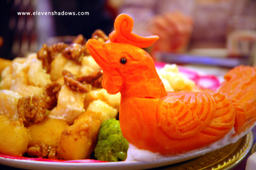 bird out of carrots.A lavish eight-course meal is typical of many Chinese weddings. Eight is a lucky number, and each course contains food symbolic of luck and good fortune. These include egg noodles (long-life), fish (abundance), duck (its red color signifies luck), plus many other courses. |
