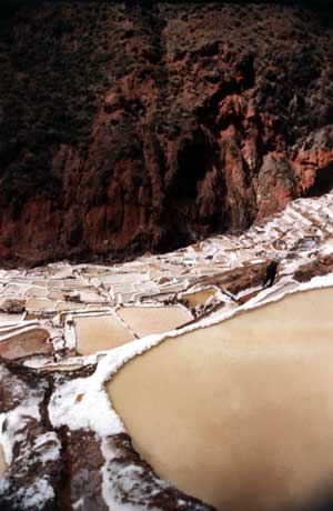 Salinas, a remote area with hundreds of salt pans used since Incan times. A hot spring at the top of the valley discharges a small stream of heavily salt-laden water, which is diverted into salt pans and evaporated to produce a salt that is used for cattle licks. |