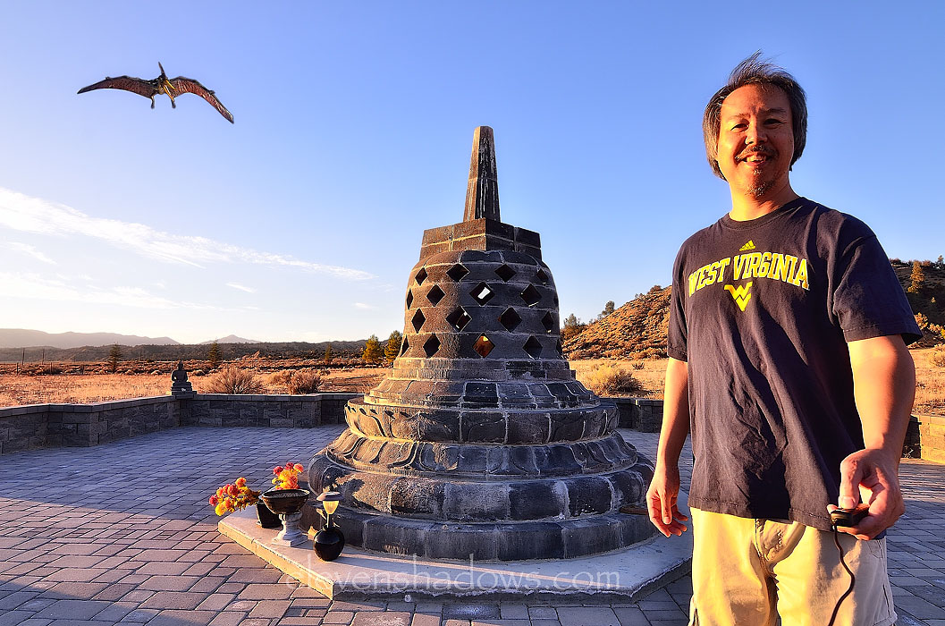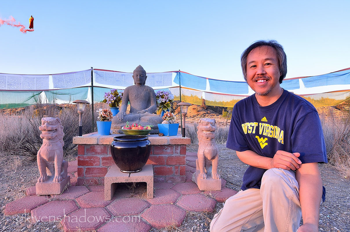 While exploring the area around Lockwood Valley Road in Ventura County with Lisa the previous month, we came across this Buddhist temple. I vowed to return. Fortunately, Reverend Phoebe was amenable, and I even spent the night at the retreat. Everyone was incredibly kind. Anybody who lets someone in to take night photos, running around their property while waving a flashlight, must be really nice. I also got a delicious vegetarian dinner. ~~~ Starry nights underneath the stupa at Pine Mountain Buddhist Temple and Meditation Retreat in the mountains of rural Ventura County, with this long exposure photo showing the movement of the stars around the North Star. A stupa typically contains relics of the Buddha and is used by Buddhists as a place of meditation. |