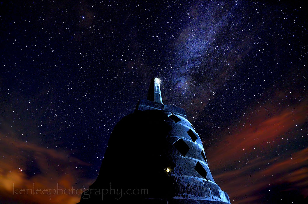 Title: Pine Mountain Stupa Milky WayPhotographer: Ken Lee Info: Nikon D7000, Tokina 11-16mm f/2.8, Feisol tripod. This is a long exposure night sky photo of 15 seconds in exposure at ISO 3200 f/2.8. I light painted the stupa with a Streamlight LED flashlight. Photo taken approximately 8:00 pm D.S.T. on 23 November 2013. Location: Pine Mountain Buddhist Temple, Maricopa, Callifornia, USA |