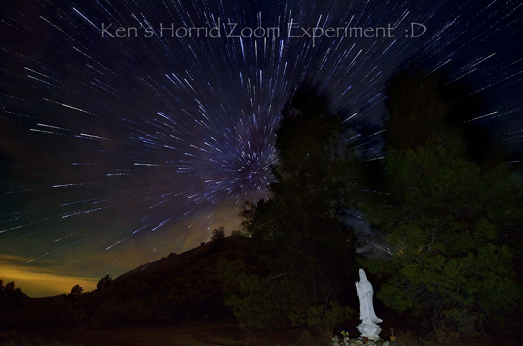 How was this done? Or at least attempted? I'm glad you asked. I took a succession of photos while slowly turning the zoom in my Tokina lens. As you can see, I didn't do it very well. But it's cool looking and I may mess around with this and really focus on getting this thing smooth instead of haphazardly doing it spontaneously as I did here. I don't remember any of the settings, but it was probably 30 second intervals at a moderately high ISO, probably something like 800, and probably f/2.8, for about 7-8 30-second sequences. I then blended in the last frame a bit more, light painting the Quan-Yin statue a bit while the last frame was being taken.