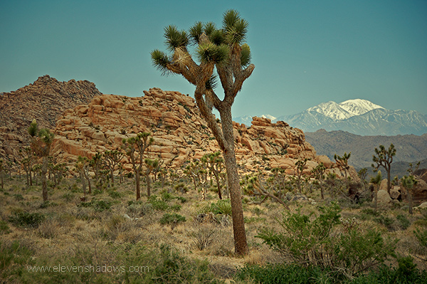 snow-capped peaks of San Jacinto as seen from the Boy Scout Trail in Joshua