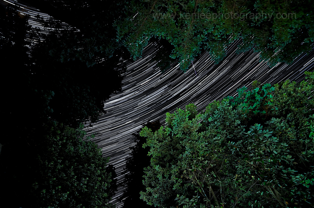 I "light painted" the trees by pointing my absurdly bright flashlight down at the wooden deck. Why? Because I didn't want the trees to be really white colored or overexposed by the bright flashlight, and pointing out down at the wooden deck created a much warmer light. The almost vertical streak near the middle is a shooting star. More info: Nikon D90, Tokina 11-16mm f/2.8 lens. Stacked photos totaling 100 minutes, stacking 200 individual photos of 30 seconds each (ISO 800, f/4), 21-22 June 2012. |