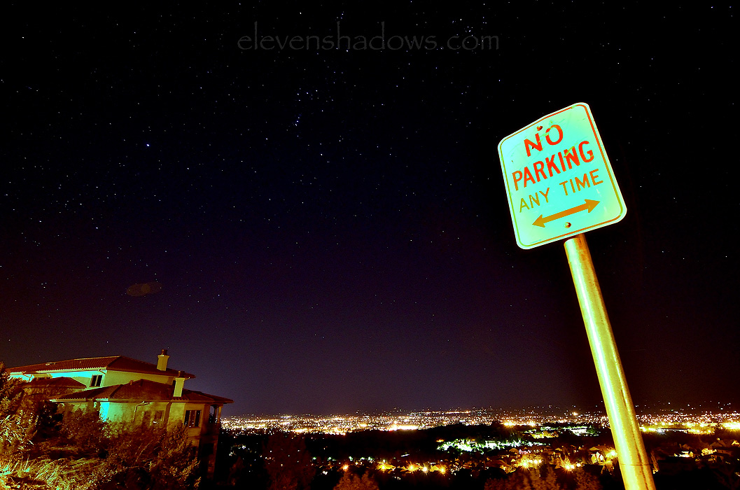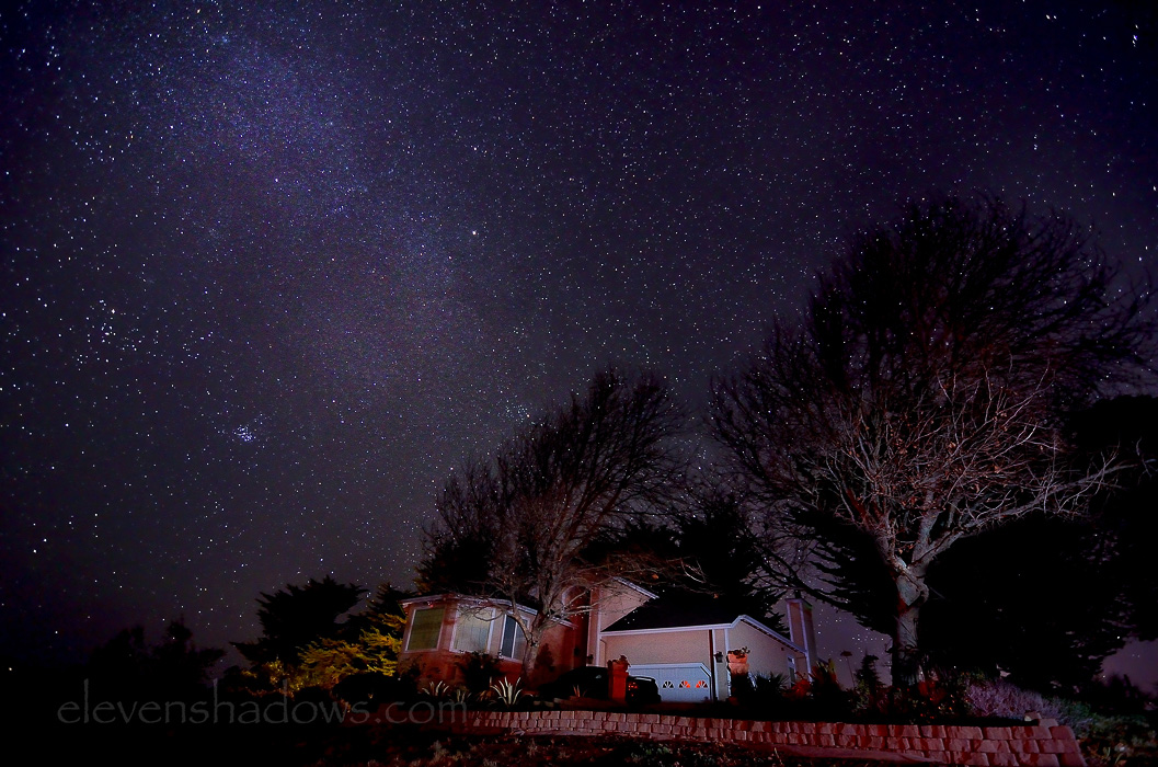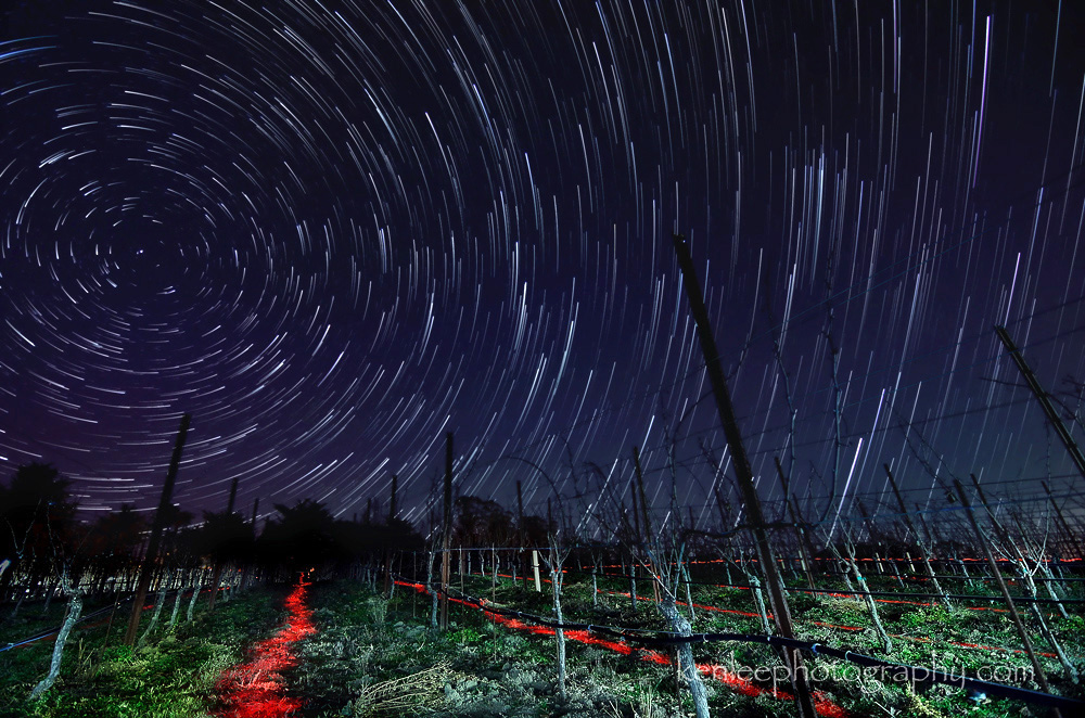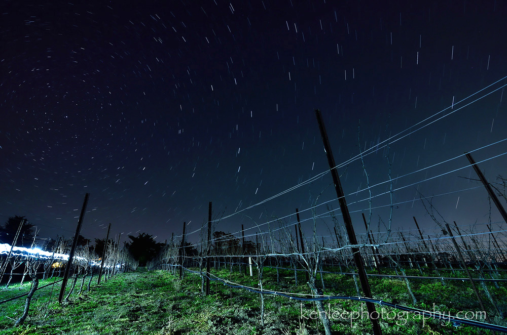 I got a little more over the top with this long exposure night sky star trails photo, "painting" the ground red with light. This was good fun and good exercise, walking up and down and up and down and up and down the hillside.Title: Bella Vigna Star Trails Photography: Ken Lee Info: Nikon D7000, Tokina 11-16mm f/2.8 lens, Feisol tripod. The total exposure is 47 and a half minute exposure, with each individual exposure shot at 30 seconds f/4 ISO 400. Light painted with LED flashlights and gels. Location: Sonoma County, CA |