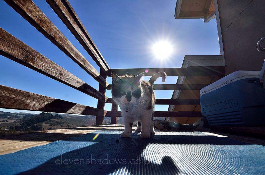 29 December 2013 - Bella Vigna/Bears-Packers/Peter Lowell's Restaurant:Another gorgeous day. The deck of the guesthouse where we were staying on Bella Vigna winery was perfect for hanging out or doing yoga, as this cat thought. |