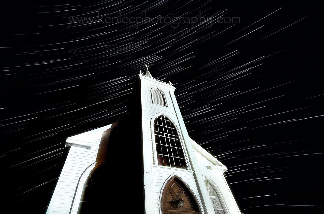 St. Teresa of Avila in Bodega. I came very close to junking this photo. Unbeknownst to me, shortly after beginning shooting the long exposure, the lens began fogging up due to the cold sea air. Ansel Adams and Alfred Hitchcock were smart. They shot during the day. Title: The Birds Star Trails |