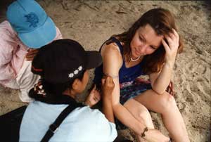 Lisa getting a tattoo, "I Love Thailand", on Bo Phut Beach on Ko Samui.