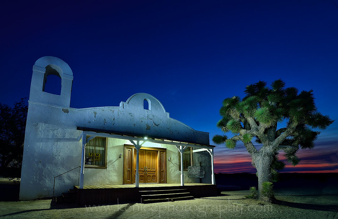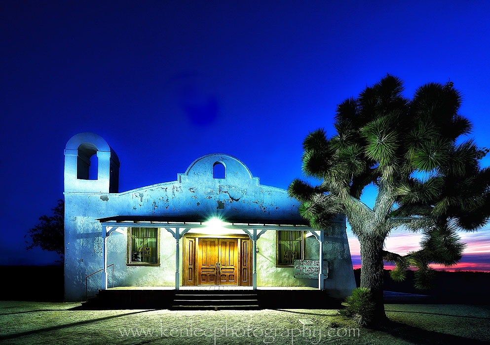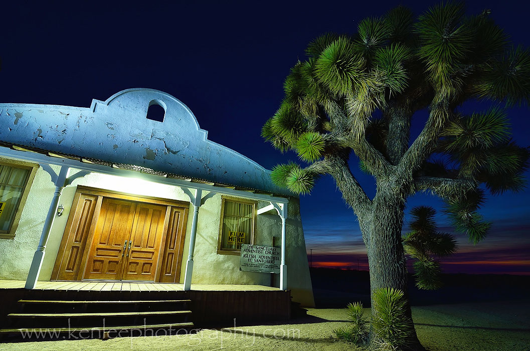 The classic straight-on view of the "Kill Bill" Church from Quentin Tarantino's movie. You can see how just in a matter of minutes, the sun is already considerably brighter in the lower right corner. The rest of the exterior of the church is really not much to look at. This is all about the front. I would love to see the interior at some point. Apparently, it's still an active church, so maybe attending A Saturday service is in order. As with the other two "Kill Bill" Church photos, because there is a single strong porch light on, I had to compensate for that by "light painting" the rest of the church not illuminated by the light as well as the Joshua Tree in front. And this takes time, so consequently, it's a 30 second exposure. f/11, 30 seconds, ISO 100. |