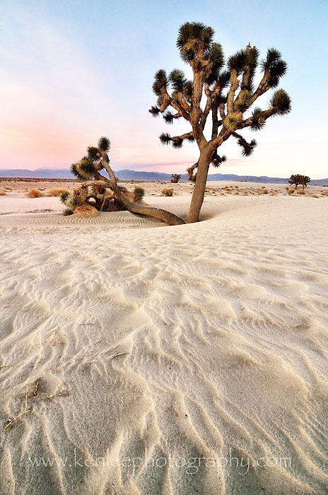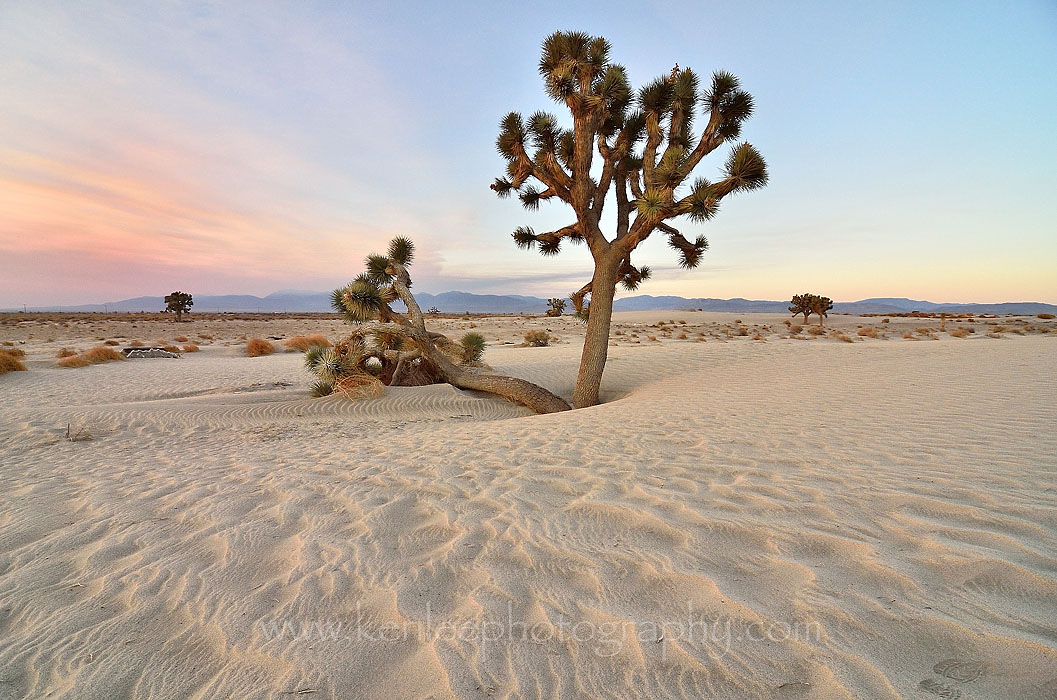 After photographing the "Kill Bill" Church, I drove back toward the 14 Freeway, toward Lancaster. But along the way, I was pleasantly surprised to see some small sand dunes among the Joshua Trees, so I got out to walk around in the beautiful cool sand as the sun continued to rise. |