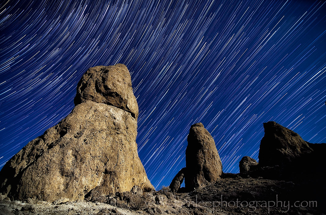 Wednesday 17 July 2013: I had the Trona Pinnacles to myself for the entire night, the desert air silent except for the occasional train rumbling past. It was to be a very peaceful evening, both here and later photographing the "Kill Bill" Church in Antelope Valley, elsewhere in the vast Mojave Desert. ~~~ Title: Trona Glow Star Trails |