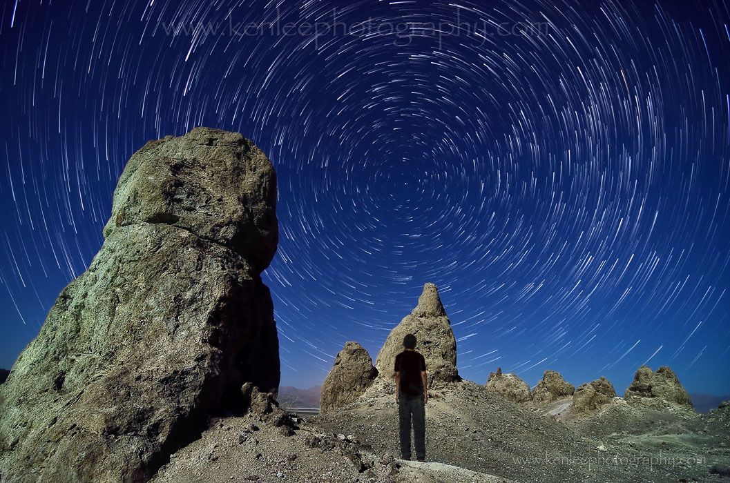 ~~~~ Title: The Stars Are The Fish That Swim Info: Nikon D7000 with Tokina 11-16mm f/2.8 lens. There are two photos blended together. The first is a 33.3 minute total exposure that was stacked in PS4, with each individual photo a 20 second exposure (by mistake), f/2.8, ISO 400. 17 July 2013 begun at 9:51 pm. This was blended with second photo of me standing in the frame. I stood as still as I could for about three minutes of this exposure while backlit with a Streamlight LED flashlight lodged in my pants pointing straight up and was glad to see me. The second photo was f/7.1, 367 second exposure, ISO 100. 9:37 pm, 17 July 2013. Pinnacles light painted with bright flashlight. |