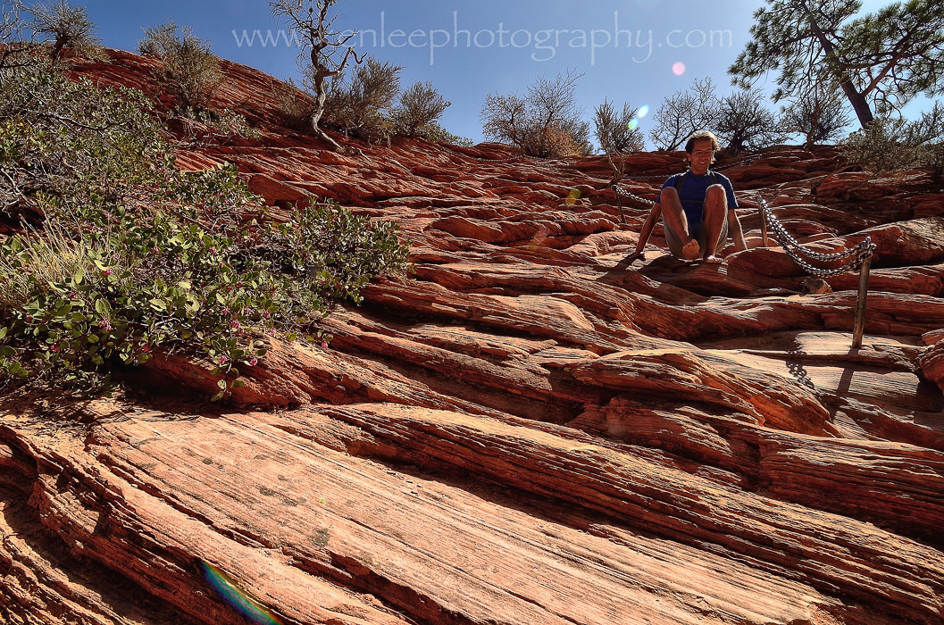 Coming back down Angels Landing, Matthew, a barefoot hiker, smiles at the beauty of the land. "I'm surprised more people aren't going barefoot," Matthew said, as at the time of this writing, Vibram Five Fingers and hiking and running barefoot have become quite popular. But indeed, he was the only one I saw that day going barefoot. Except for George, of course. |