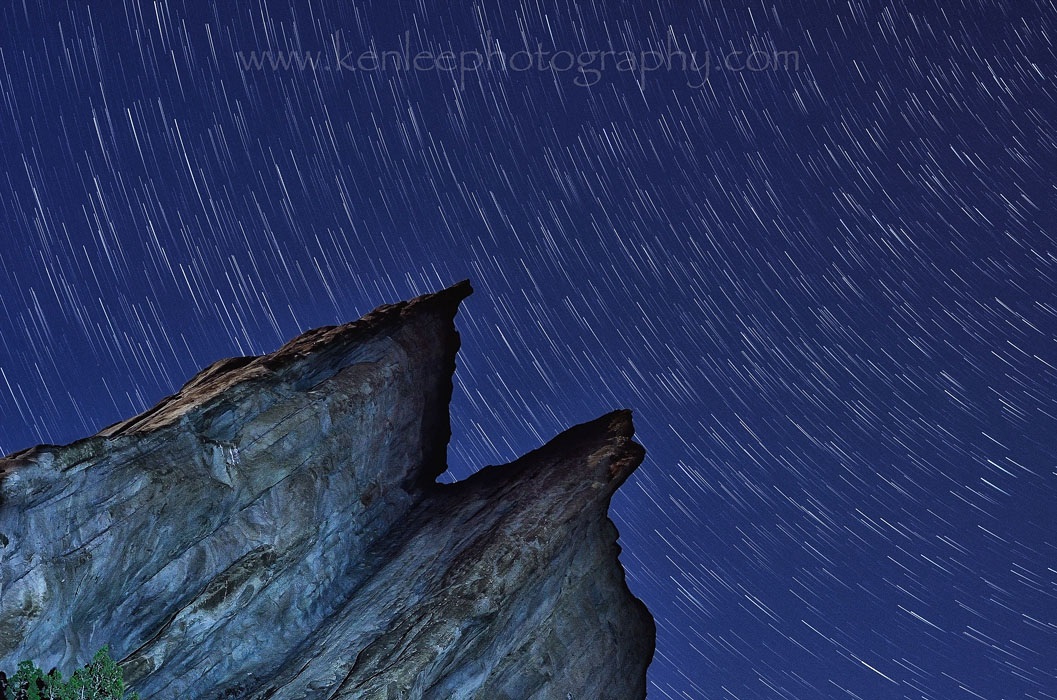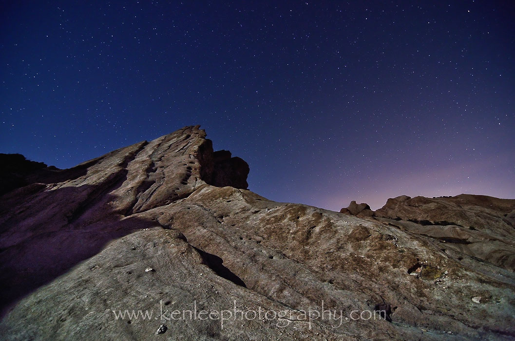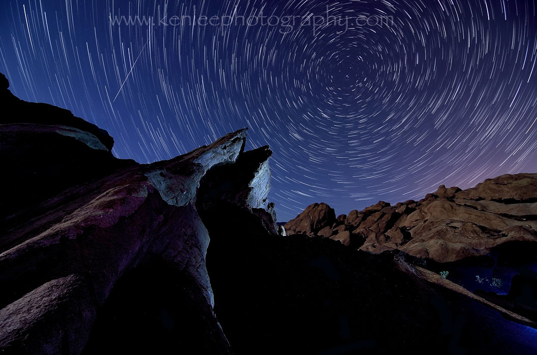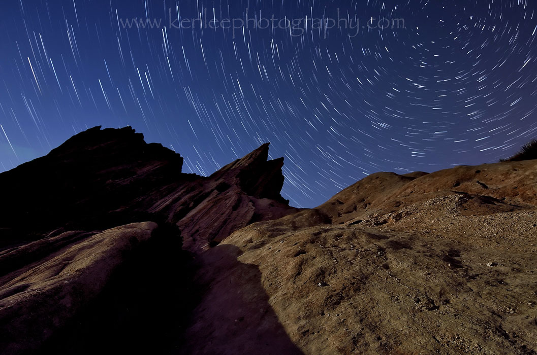 Vasquez Rocks was also used for Spock's home planet Vulcan, although it was digitally manipulated a bit.Title: The Gorn Star Trails Info: Nikon D7000, Nikkor 50mm f/1.4 lens, lens. 9 and a half minutes, each exposure f/4 for 30 seconds at ISO 320. Light painted with Dorcy spotlight. 19 April 2013 midnight. Photographer: Ken Lee Location: Vasquez Rocks, California, USA |