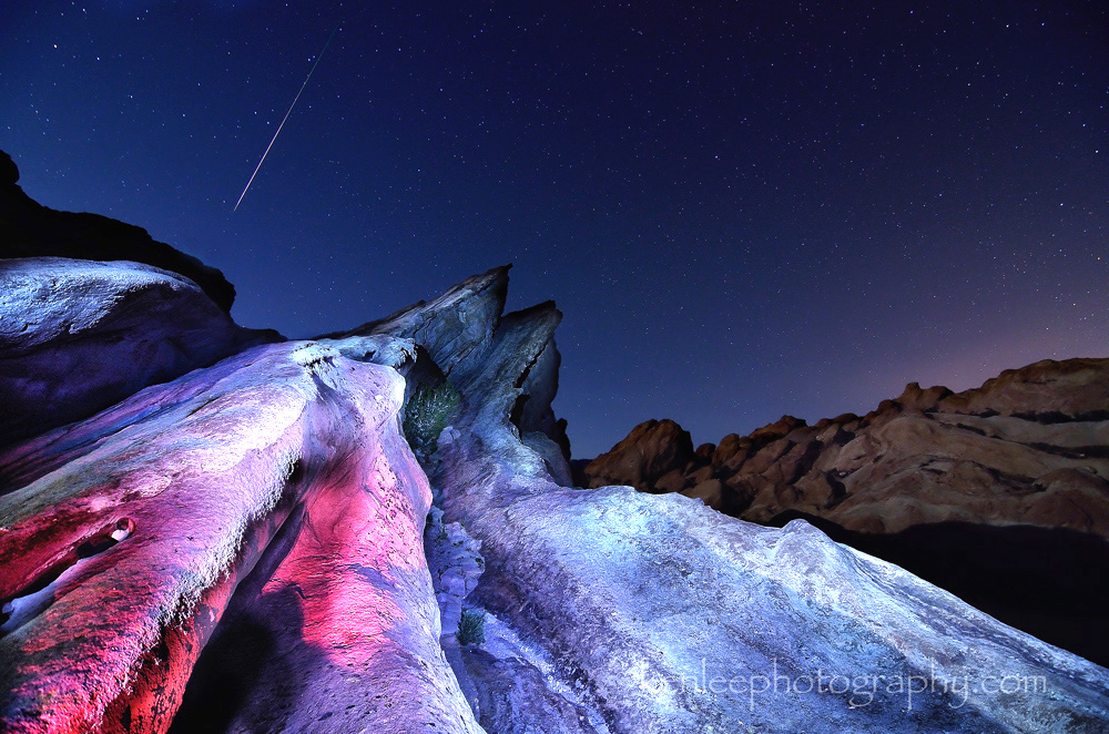Vasquez Rocks. Unique and, at least for Star Trek fans, easily recognizable rock formations, the location where Captain Kirk fought the Gorn lizard man on "Star Trek". Yes. And a good place to photograph at night, I think, particularly when during meteor showers such as the Lyrid Meteor Shower. In 687 BC in Zuo Zhuan, one of the earliest Chinese works of narrative history, described the Lyrid meteor shower: "At night, fixed stars are invisible, at midnight, stars dropped down like rain." Here I was lucky enough to capture one of the Lyrid meteors! Title: Stars Dropped Down Like Rain - Lyrid Meteor Shower Over Vasquez Rocks