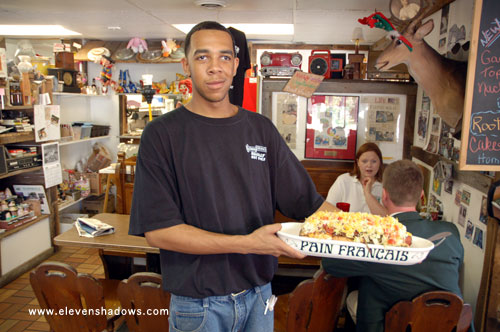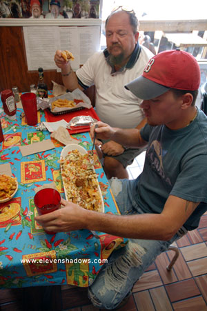 We made a pilgrimmage to the fantastic Hillbilly Hot Dogs in Huntington, West Virginia. There, they serve the Famous Homewrecker, a giant one-pound deep-fried weenie smothered in peppers, onions, nacho cheese, chili, jalapenos, mustard, slaw, tomatoes, and shredded cheese. If you finish this monstrosity within 15 minutes, you get a free Hillbilly Hot Dogs T-shirt. |