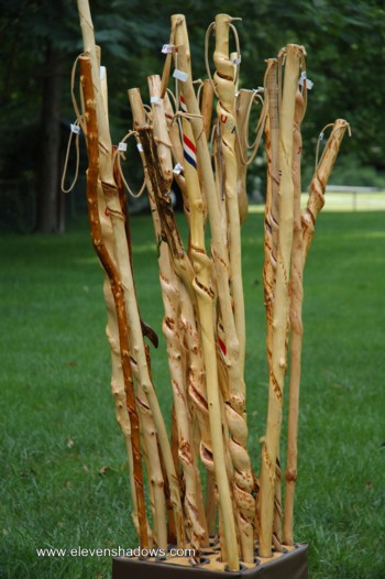 Some of Paul's finished walking sticks, carved from wood he finds while hiking in the woods in back of his house in Charleston, West Virginia. |