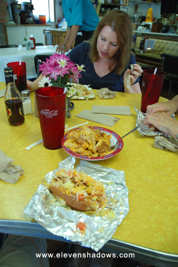Gregarious owner Shari McGarry recognized me from a year ago. She's an enthusiastic people person. That may have been it. Or maybe there's not too many six-foot Chinese guys eating there. Missing the Cuisine of my Land, I ordered the Taco Dog, with crunched up chips, jalapenos, shredded cheddar cheese, nacho cheese, chili sauce, maters, picante sauce, lettuce, and sour cream piled high on a weenie. Oh, and some chili cheese fries. Yummmmm!!! You can see both of these in the next photo. |