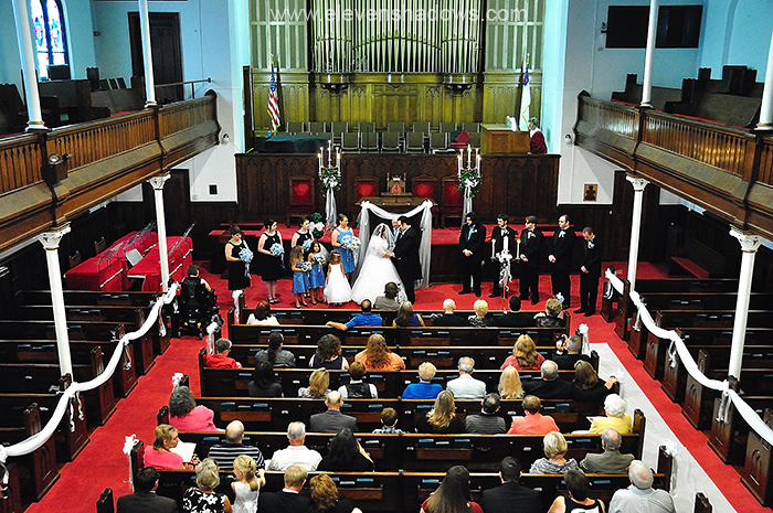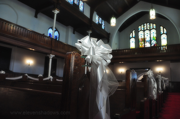 After photographing Carrie getting her hair done, we drove over to the church. I set up both of Carrie's lights and set up the tripod and camera in the second pew so I'd have enough room for the formal photos.