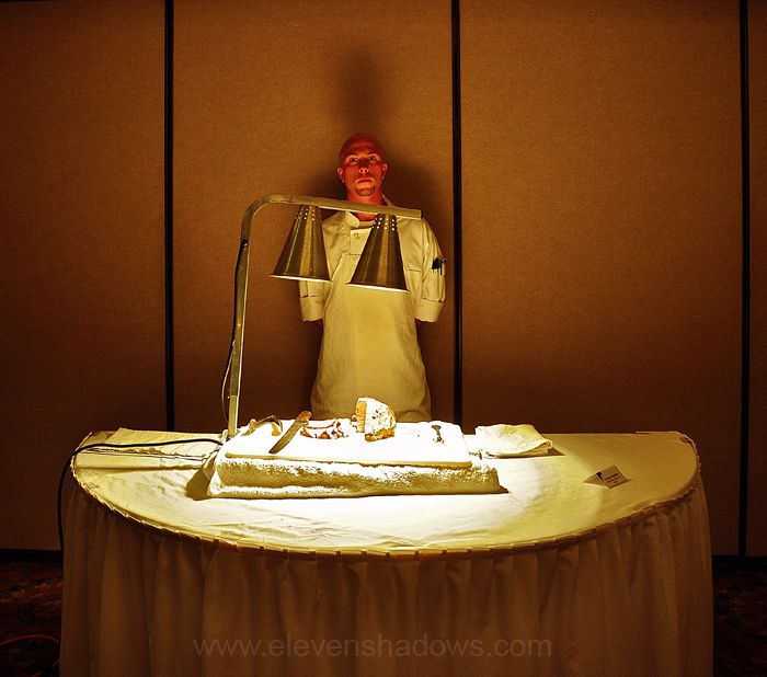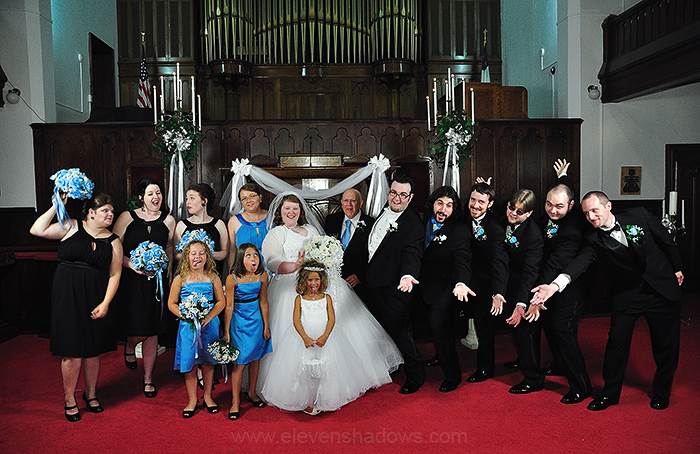 For both rounds of formal shots, I tried to make it fun by having people do silly photos, such as the one here. I'd start off with some serious shots, move to the silly shots, and then sometimes, if the "serious" shots seemed a little stiff, I'd go back to taking a few more serious shots since they had gotten loosened up. But really, everyone was more than happy to get weird. The lights had to be spread farther apart. The borrowed extension cords didn't stretch that far without the light falling over, so Lisa had to hold one of the lights for the entire second round of formal shots! And Lisa had been taking shots at the church as well. We packed up all the photographic equipment and made our way to the Holiday Inn, where the reception was being held. |
