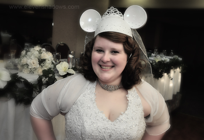 happy bride with her mouse ears and her gorgeous wedding dress. At the end