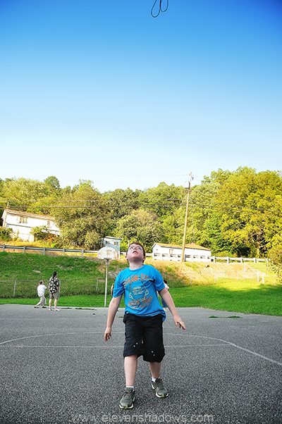 Liam, watching the ball go through the dilapidated hoop.