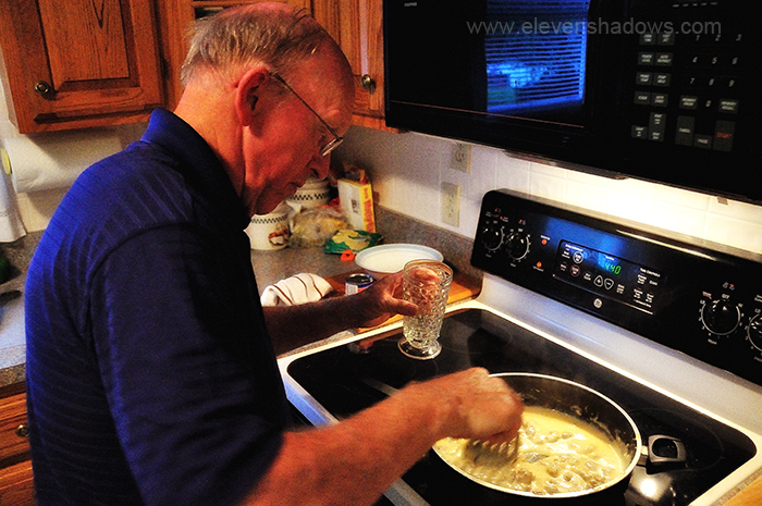 This is Lisa's Dad making his incredible homemade gravy. I think it's the best gravy I've ever had. Here he's just about to add a glass of cold water to prevent the gravy from becoming lumpy.