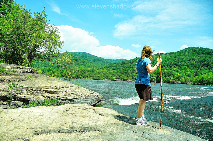Lisa at the New River, ironically one of the oldest rivers in the world, with her Appalachian walking stick, handmade in West Virginia.