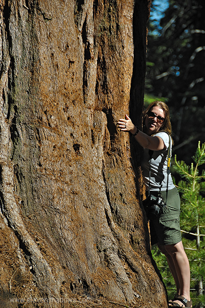 the tree-hugger shows her love for one of the giant sequoias in Redwood