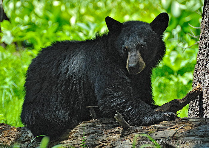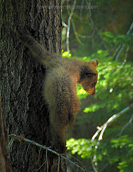 out she was right!!As we walked among the giant sequoias, we came upon a pack of tourists busily click--click-clicking away with credit-card sized cameras, some only fifteen feet away from this baby bear, some of their flashes going off! I looked around for the mother, then stood in back of them, taking photos between them. And THIS is why we use 300mm telephoto lens when photographing wildlife! |