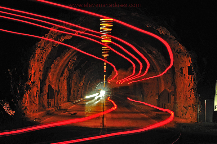 20-second exposures of the long tunnel that cuts through the mountain.